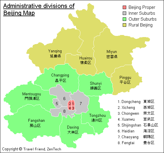 Beijing is located in northern China, and is for the most part surrounded by Hebei province. It’s composed of 14 urban and suburban districts, as well as two rural counties. Although the city itself lies on flat land, Beijing municipality on a whole is quite mountainous. To the west lie the Western Hills (西山 – xī shān), and to the north Yanshan (燕山 – yàn shān). These two mountain ranges meet in the northwest part of the city, creating a huge fault line and rift valley. In addition to mountains, Beijing also has water – a few small lakes in the city center and big reservoirs out in the countryside.