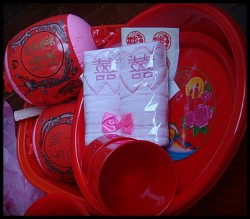 In the last post, we looked at some of the ancient wedding customs of China. For Part Five, we’ll take a look at a few more pre-wedding customs, as well as the big day in Chinese culture – the wedding day. A lot of these customs are very traditional, but many are still practiced today (to some extent). Before the wedding, the bride’s family will prepare her dowry (嫁妆 – jià zhuāng). The dowry is composed mostly of daily necessities such as linen, dining sets (with two bowls, two cups, and two pairs of chopsticks), new clothes, gold jewelry, tea sets, and a barrel of descendants (子孙桶 – zǐ sūn tǒng), which is a set of baby bathtubs, pails, and a face washbasin, all in red.