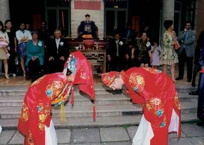 Next up is the actual wedding ceremony (拜堂 – bài táng), the Chinese equivalent to wedding vows in the West, the couple will kowtow three times: to the heaven and earth, to the ancestral tablets, and their parents. Then, they bow to each other. In modern Chinese weddings, it is more common to either simply bow, or to forgo this party of the ceremony entirely.