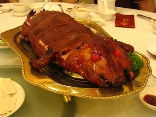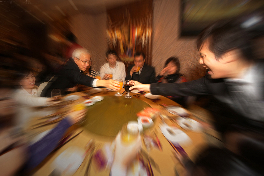 For the main event, a massive wedding banquet (结婚宴席 – jié hūn yàn xí) is held. This is also called “joyful wine” (喜酒 – xǐ jiǔ). A huge feast is served, with upwards of 12 courses, along with plenty of Chinese spirits (白酒 – bái jiǔ). These days, wedding banquets are usually held in a restaurant or hotel. I’m not sure if this is a traditional Chinese wedding custom or not, but in the one wedding I’ve taken part in, the groom went around the room and did a “Cheers!” (干杯 – gān bēi – lit. “dry glass”) with every single person. Needless to say, he was good and drunk by the end of it.