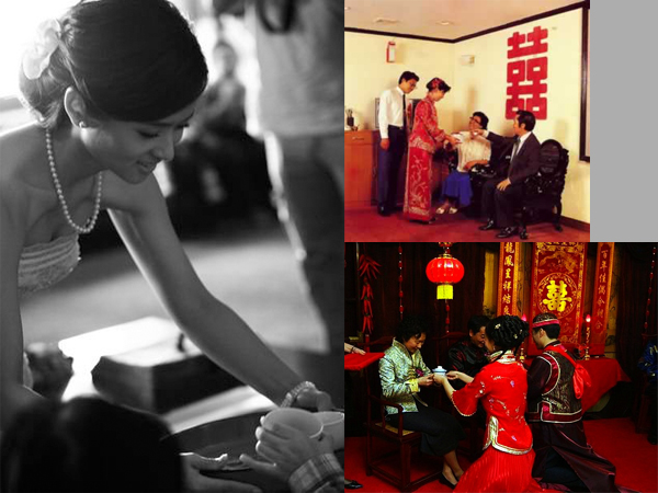 Then comes the all-important tea ceremony (奉茶 – fèng chá). Usually, the bride and groom will kneel and serve tea to their elders, starting with the groom’s parents. After serving the parents, they will serve the tea in order from the oldest to youngest. For example, the groom’s paternal grandparents (祖父母 – zǔ fù mǔ) would be next, followed by his maternal grandparents (外祖父母 – wài zǔ fù mǔ), then his aunts and uncles, and finally his siblings. In return, the newlyweds receive either red envelopes (红包 – hóng bāo) stuffed with money, or jewelry.