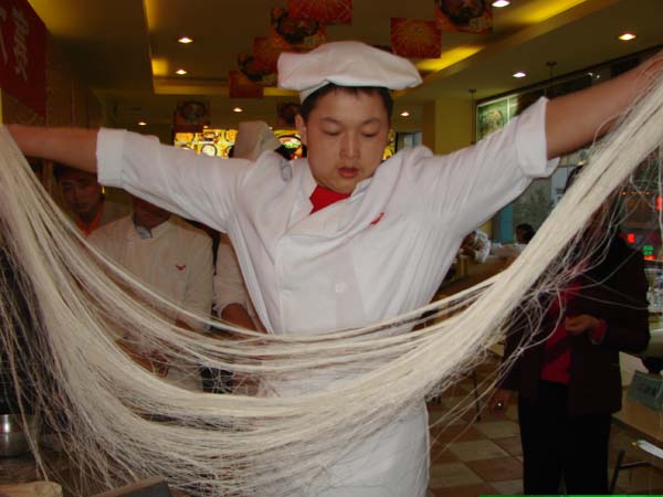 Much like its Japanese equivalent, ramen, 拉面 is an ancient practice of literally “pulling” noodle apart from one big chunk of starch. Hence the transliteration: “pull noodle”. Watching a 拉面 noodle master go to work is much like watching an Italian chef hand toss a pizza crust; involving an amazing slight of hand and strength that includes a little entertainment for the salivating audience.