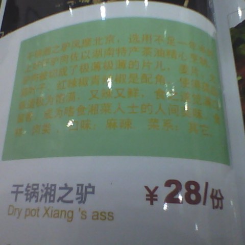 For anyone who’s been to China, you’re probably very familiar with the wonderful art of Chinglish (中式英语 – zhōng shì yīng yǔ). From hilarious t-shirts in the market that display text such as, “I give all a smile because I am in the cheerful monkey,” to silly signs on the lawn encouraging you to “Cherish the poetry feelings of grass,” to that well-known Chinglish proverb “Good good study, day day up” (好好学习天天向上 – hǎo hào xué xí tiān tiān xiàng shàng), Chinglish is everywhere you look here. Some of the funniest Chinglish can be found on the menus of local restaurants, where direct translations of Chinese names often result in very funny English names. Unfortunately, the powers that be in Beijing are doing their best to do away with Chinglish menus in the city by offering restaurants a detailed list with the official English names of thousands of famous Chinese dishes. While there may come a sad day in the future where you no longer find “chicken without a sex life” or “red burned lions’ heads” on the menu, thankfully the authorities can’t move fast enough to do away with the widespread Chinglish that exists on Beijing menus. To prove this, I present to you a series of pictures fresh from the menu of a restaurant located on the campus of one of China’s most famous universities, where I work as an English teacher.