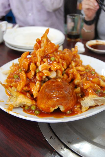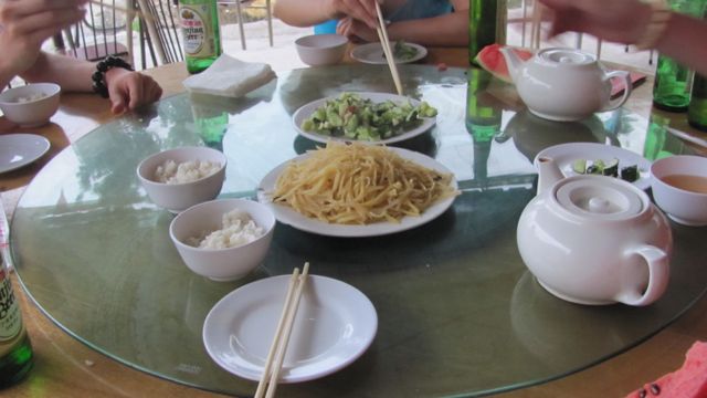 Prior to coming to China, I thought of Chinese food as General Tso’s chicken, egg rolls, crab rangoons, and fortune cookies. After arriving here, I quickly found out that not a single one of those things is served in China. In my first few weeks here, the group I was working with went out to dozens of group dinners. We were introduced to the Chinese way of dining out, and there was quite a bit of culture shock involved. For one, the community style of dining was new to me. Sure, I did that at family dinners growing up, but never really out in restaurants. In America, I was used to maybe sharing an appetizer with someone and then everyone ordering their own main course. In China, many dishes are ordered and placed on a lazy Susan. The table is spun around and you grab what you like. And we’re not just talking a starter, a main, and dessert here; a Chinese dinner is a marathon of food. Usually it starts out with some cold dishes (凉菜 – liáng cài), and then moves into a wide variety of main courses. Of course, there are always some staple foods around – rice, dumplings, or noodles. Soup comes last in a Chinese dinner instead of first, and dessert usually consists of a massive fruit plate.