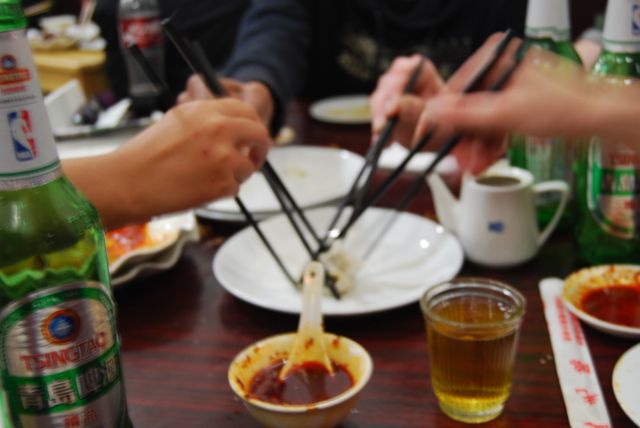 Dining out is also a very social experience in China, and by that I mean it’s hella noisy. Back at home, I was taught to politely and quietly eat in a restaurant, and say things like, “Excuse me, waiter. Could I have a glass of water?” I quickly realized that in China, however, you can just yell out, “Waiter! Bring a glass of water!” (服务员!来一杯水!- fú wù yuán! lái yī bēi shuǐ!). Chinese restaurants are usually crowded, noisy, and smoky. There are “no smoking” signs posted everywhere in Beijing, but no one seems to pay them any mind. I was always taught that it was rude to noisily eat my food, but here in China slurping your noodles is a sign that you enjoy them. A dinner out in China is usually quite raucous, and more often than not it involves heavy drinking. The booze related culture shock will be discussed at a later date, as that is definitely its own beast.