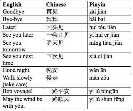 Here are ten Chinese goodbyes, with English, Chinese characters, and pinyin transliteration: