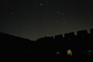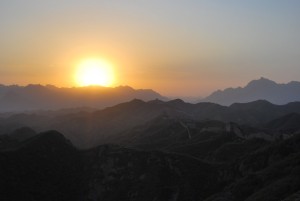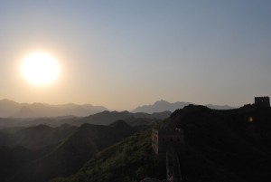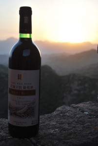 Arriving at the Wall around 5 p.m., we hiked up just in time to relax and watch the sunset on the Chinese countryside and the iconic landmark. Equipped with a bottle of Great Wall red wine (红葡萄酒 – hóng pú táo jiǔ), we had a perfect photo op. When the sun went down, there wasn’t much to do, as we had neglected to bring a light of any sort. Being adventurous guys, we also made the trip without a tent. We plopped our sleeping bags (睡袋 – shuì dài) down on the ground, munched on some snacks, and admired the starry sky. Within the city, one almost forgets that stars actually exist, as the bright lights of Beijing drown them out every night. And so we slept under the glow of the stars, inside one of the guard towers of the Great Wall of China.